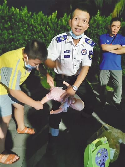 还在上小学的严梓润是父亲的最佳搭档。他们一个身穿急救志愿者的制服,一个身穿海口市滨海小学的校服,父子俩默契的配合让围观路人称赞不已:“他们的动作干脆利落,教得好!”