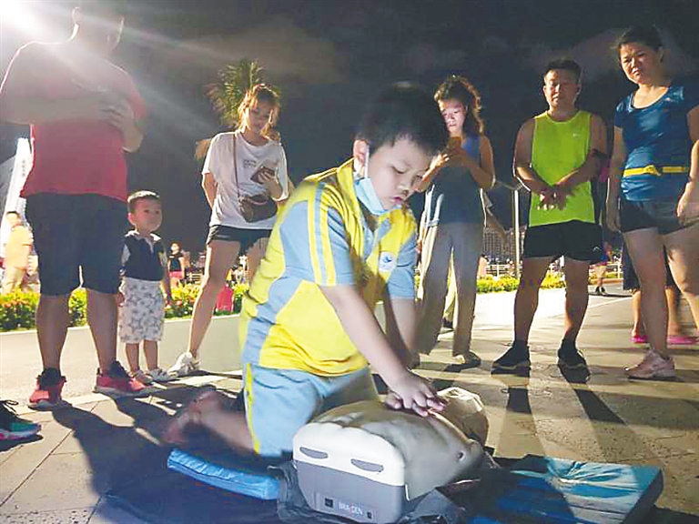有人摆摊卖冰棍,有人摆摊秀才艺,如今海口湾绿道上又多了一道风景:有人摆摊免费教“救命”。