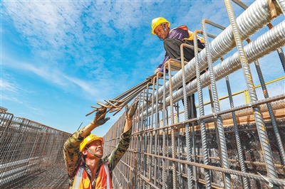 7月15日,在海口绕城高速二期项目机场互通施工现场,工人头顶烈日正在抓紧施工。目前,该项目已累计完成施工总产值的64%。