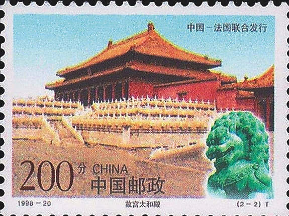 第二套太和殿邮票是1998年由中法两国联合发行,一共两枚,第一枚是法国卢浮宫,另一枚是故宫太和殿,面值分别为50分和200分,规格为40mm×30mm。
