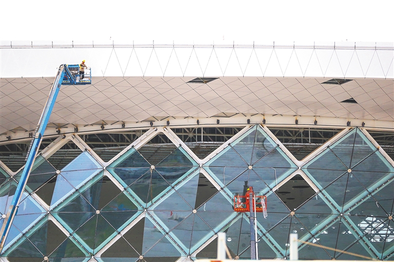 7月20日,正在加紧建设中的海南国际会展中心二期项目现场,施工人员将玻璃嵌入框架。目前,该项目外立面幕墙装饰以及内部装修均已进入收尾阶段,施工总进度超过90%。本报记者 张茂 摄
