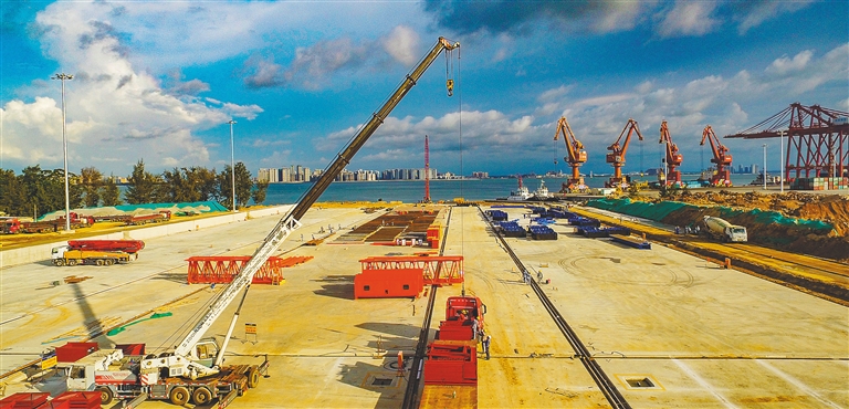 近日,在洋浦经济开发区海南炼化100万吨/年乙烯及炼油改扩建工程项目配套码头沉箱预制场,工人正在操控机械加紧施工。该预制场今年5月动工建设,目前正在安装部分设备,建成后将为100万吨/年乙烯及炼油改扩建工程项目建设提供有力支撑。本报记者 陈元才 摄