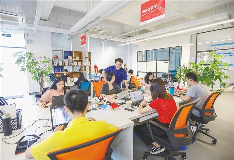 7月18日17时许,在位于海南自由贸易港海南生态软件园沃克公园8857号楼的椰云网络科技有限公司内,年轻的工作人员正在各自的工位上忙碌着。