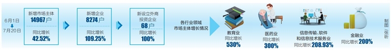 分行业领域看,自6月1日至7月20日,海口市信息传输、软件和信息技术服务业,金融业,教育业,医药业市场主体大幅增长,其中,教育业同比增长530%,医药业同比增长300%,信息传输、软件和信息技术服务业同比增长208.93%,金融业同比增长200%。