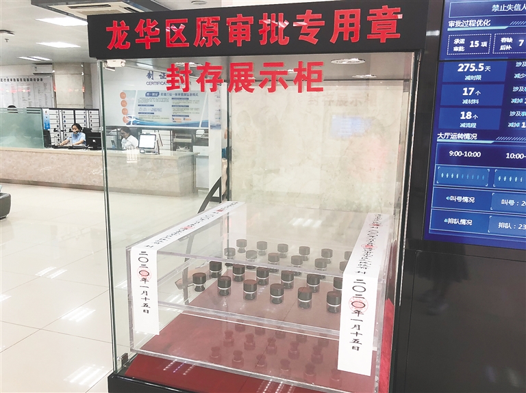 在海口市龙华区政务服务大厅里,摆放着一个展示柜,柜子里整齐陈列着24枚印章,吸引了前来办事的群众驻足观看。这24枚印章,原本是属于市发改、住建、环保等24个原有审批职能部门的审批专用章。如今,通过“一枚印章管审批”改革,这些印章都已被封存并不再使用,办理事项可集中审批,盖一个印章即可。