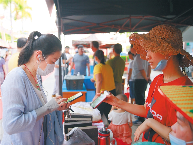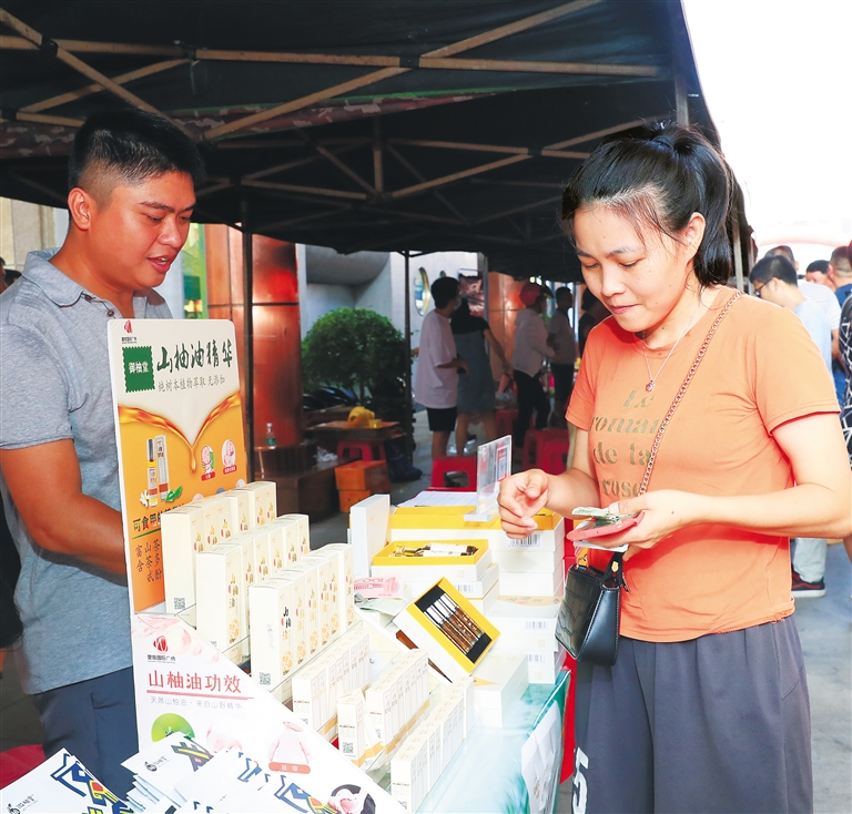 7月25日至26日,儋州市在那大镇鼎尚广场举办2020年“买产品、献爱心、促脱贫”扶贫集市活动,2天共卖出51.6万元扶贫农产品。图②,市直机关干部购买儋州土糖等特色产品;图③,山柚油深加工产品获得市民喜爱。羊文彪 摄