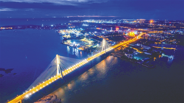 在洋浦经济开发区,经过亮化改造后的洋浦大桥夜景美不胜收。近期,洋浦大桥进行亮化改造,大大提升了洋浦园区的“颜值”。本报记者 陈元才 摄
