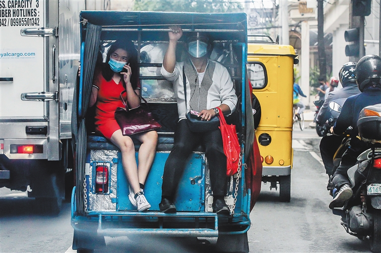 8月2日,人们戴着口罩在菲律宾马尼拉街头出行。