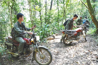 自此,每到巡山的时间,清晨4时许,莽莽群山下,几束灯光投谢山间小道:李文永一行几名监测队员就背上10多斤的设备、工具以及干粮等,穿上印有“海南长臂猿监测队”字样的巡护服,骑上那“爬山路性能极好”的鹰牌摩托车,开始他们一天的巡山工作。