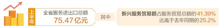 上半年,全省服务进出口总额75.47亿元,其中新兴服务贸易额占服务贸易总额的41.39%,远高于去年同期的25.2%。全省服务贸易伙伴共96个,与中国香港、美国、新加坡、爱尔兰、加拿大的服务贸易额占服务贸易总额的62.87%。