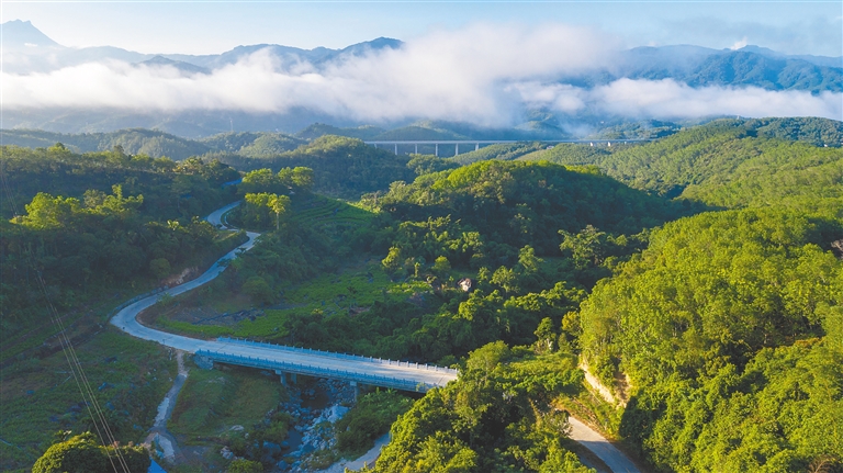 近日,俯瞰位于鹦哥岭南麓的通往琼中黎族苗族自治县什运乡便文村的农村公路,山头白云之下、郁郁葱葱之间,村路畅通无阻。据悉,海南大力推进农村公路六大工程建设。截至今年上半年,我省累计完成农村公路六大工程14081公里,占总计划的90.9%。本报记者 李天平 摄