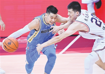 8月4日,在青岛举行的中国男子篮球职业联赛(CBA)季后赛半决赛首场比赛中,北京首钢队109:111不敌广东东莞银行队。图为北京首钢队球员林书豪(左)在比赛中突破。 新华社发