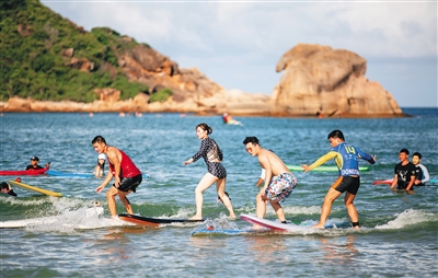 在三亚后海、万宁日月湾这样的冲浪胜地,皮肤黝黑的冲浪爱好者与海浪共舞,享受着与大自然的亲密接触。“俱乐部的接待量在5月迎来较大增长,与去年同期相比,7月达到七八倍的增长。”万宁盘古掌体育创始人陆盛华告诉记者。