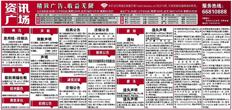 ●王晶晶于2020年8月4日遗失身份证,证号:460002197804165821,特此声明。