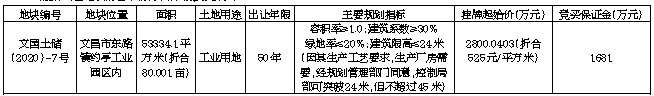 二、中华人民共和国境内外的法人、自然人或其他组织(法律另有规定者除外)均可申请参加竞买(注:失信被执行人不得参与本次竞买),申请人应单独申请竞买。本次挂牌不接受联合体竞买,不接受竞买人电话、邮寄、电子、口头报价。三、本次国有建设用地使用权挂牌出让设有底价,按照出价高者且不低于底价者得的原则确定竞得人。四、本次挂牌出让的详细资料和具体要求,详见挂牌出让手册。申请人可于2020年8月6日至2020年9月3日到文昌市自然资源和规划局三楼自然资源权益和开发利用室或海南省公共资源交易服务中心一楼受理大厅3号窗口(土地产权交易)购取挂牌出让手册和提交书面申请。五、申请人交纳竞买保证金的截止时间为2020年9月3日17时00分(以竞买保证金到账为准)。经审核,申请人按规定交纳竞买保证金,具备申请条件的,我局将在2020年9月3日17时30分前确认其竞买资格。六、本次国有建设用地使用权挂牌活动定于2020年8月27日8时30分至2020年9月7日上午11时00分在海南省政府会展楼二楼省公共资源交易服务中心土地交易厅进行。(2020年9月7日上午11时00分在海南省政府会展楼二楼省公共资源交易服务中心土地交易厅召开挂牌现场会)。七、开发建设要求:(一)本次出让宗地属水产饲料加工厂项目用地。竞得该宗土地后,竞得人须严格按照批准的项目规划设计方案要求,以及有关部门的行业规定,在三个月动工建设项目,两年内完成项目的投资建设。不按批准的项目规划设计要求进行开发建设,以及不履行《国有建设用地使用权出让合同》约定的,报经市政府批准后,按该合同约定,退还除该合同约定的定金以外的全部或部分国有建设用地使用权出让价款(不计利息),收回国有建设用地使用权;受让人造成土地闲置,闲置满1年不满2年的,依法缴纳土地闲置费;土地闲置满2年且未开工建设的,出让人有权无偿收回国有建设用地使用权。(二)按照《关于印发<海南省建设用地出让控制标准(试行)>的通知》(琼国土资规〔2018〕7号)和《关于实施产业项目发展和用地准入协议的指导意见》(琼国土资规〔2018〕8号)有关规定,本次出让宗地工业项目用地控制指标,投资强度为不低于300万元/亩,不设定年度产值指标和年度税收指标,开发建设的项目产值和税收征缴按照现行有关法规政策规定执行,达产年限5年。以上控制指标按规定列入《产业项目发展和用地准入协议》,属于协议内容的组成部分,竞得人在签订国有土地使用权出让合同时,一并与文昌市科学技术工业信息化局签订《产业项目发展和用地准入协议》。(三)竞得土地后,竞得人须在文昌注册公司进行项目开发,拟注册成立新公司进行开发建设的,申请人应在申请书中明确新公司的出资构成、成立时间等内容。如已在文昌注册具有相应土地开发资质的公司,可不再注册公司。(四)竞得土地后,竞得人须按规定完善该宗地施工报建、地质、压覆矿、消防、环保等审批手续,方可动工建设。(五)该宗地若需要实施装配式建筑,应按照装配式建筑有关规定执行。八、其他需要公告的事项:(一)本次出让宗地按净地条件出让,即土地权利清晰,收回土地和地上附着物已补偿安置到位,无法律经济纠纷、土地开发利用规划条件明确、符合土壤环境质量要求、具备动工开发所必需条件。竞买人应当现场踏勘出让地块,竞买人申请参加竞买的,视为对出让地块净地条件无异议。(二)竞得土地后,竞得人须按照签订的《成交确认书》约定与文昌市自然资源和规划局签订《国有建设用地使用权出让合同》,按合同约定及时缴纳土地出让金。(三)出让价款缴纳:土地出让成交后,必须在20个工作日内签订出让合同,合同签订后1个月内必须缴纳出让价款60%的首付款,余款要按合同约定及时缴纳。分期支付国有建设用地使用权出让价款的,受让人在支付第二期及以后各期国有建设用地使用权出让价款时,同意按照支付第一期土地出让价款之日中国人民银行公布的贷款利率,向出让人支付利息。(四)本次挂牌出让事项如有变更,届时以变更公告为准。(五)本公告未尽事宜详见《文昌市国有建设用地使用权挂牌出让手册》,该手册所载内容为本公告的组成部分。九、联系方式:联系地址:海南省文昌市文城镇白金路2号、海南省公共资源交易服务中心一楼受理大厅3号窗口、海南省海口市国贸北路10号金融花园D座1301室