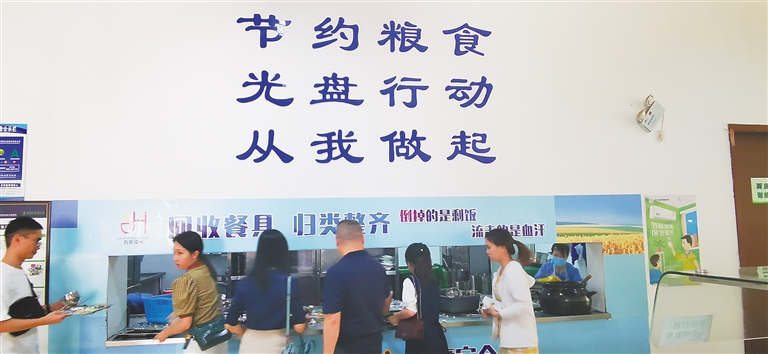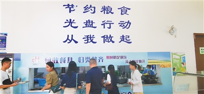 8月6日,在洋浦经济开发区的一个食堂,用餐者在用餐完后,自觉地排队将餐具回收。本报记者 陈元才 摄