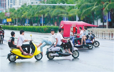 8月5日,在儋州市白马井镇,几个男孩骑车时“耍杂技”,让人捏一把汗。本报记者 陈元才 摄