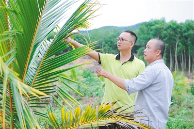 “阿飞,你这椰树怎么种的?我的椰树叶子上长了些黑斑,不知怎么办。”8月5日下午,一场雨刚停下,澄迈县仁兴镇东兴岭村村民黄贻强便骑着电动车赶往仁兴镇走马村找澄迈文椰合作社负责人李南飞请教。