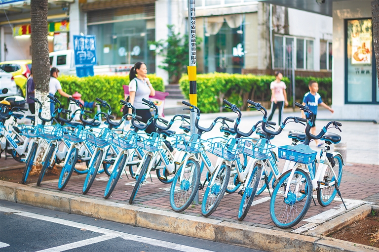 8月7日,海口市龙华区金盘路,共享单车有序停放在路边。本报记者 袁琛 摄
