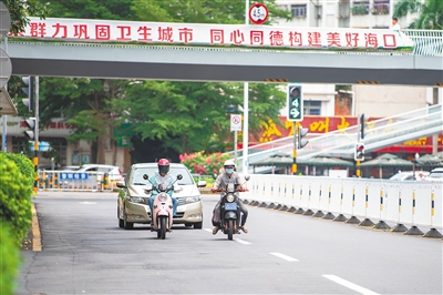 8月5日,在海口市美兰区蓝天路,两辆电动车行驶在机动车道上。 本报记者 袁琛 摄