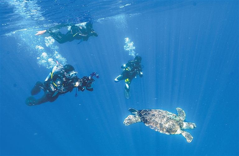 图为放流活动上,潜水员正在拍摄一只重归大海的海龟。