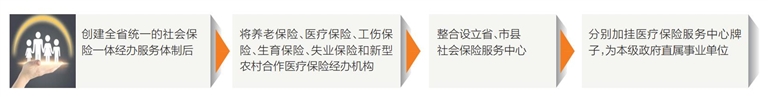 据介绍,长期以来,各地城镇居民医疗保险、职工医疗保险与新型农村合作医疗保险分别由社会保障、医疗保障、卫生健康等部门负责,群众办理各类社会保险需要找不同部门。此次创建全省统一的社会保险一体经办服务体制后,在机构上做减法,将养老保险、医疗保险、工伤保险、生育保险、失业保险和新型农村合作医疗保险经办机构,整合设立省、市县社会保险服务中心,分别加挂医疗保险服务中心牌子,为本级政府直属事业单位,业务上分别接受本级人力资源和社会保障部门、医疗保障部门的政策指导、管理和监督,创建省域社会保险一体经办体制。