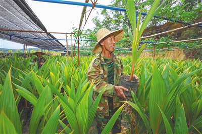 日前,在屯昌县新兴镇新兴农庄,工人正在管护椰苗。