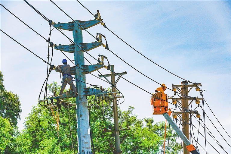 近日,在洋浦经济开发区,电力工作人员在对园区电网进行升级改造。目前洋浦园区建设步伐加快,用电需求量大,洋浦电力部门也努力升级改造电力设施,以满足园区建设需要。