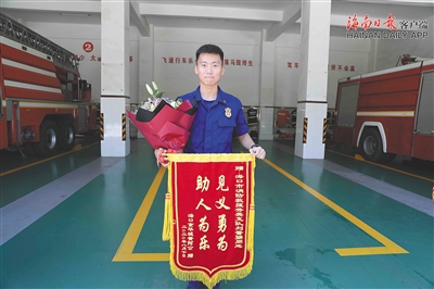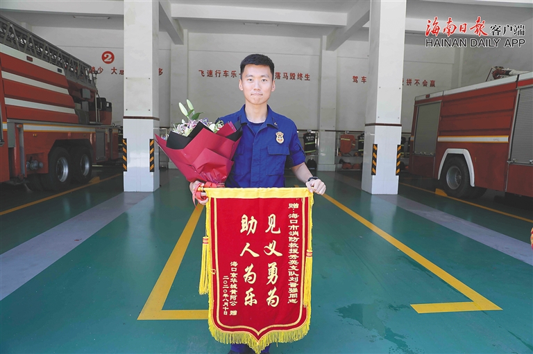 8月10日上午,一面写着“助人为乐 见义勇为”两行金字的锦旗,送到了海口市消防救援支队秀英区大队长秀路救援站一位小伙子手中。