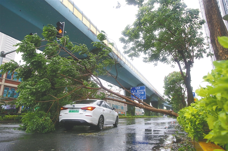 8月11日,在厦门市思明区厦禾路,一辆汽车被倒伏的树木压住。