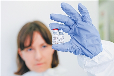 8月6日,在位于俄罗斯首都莫斯科的“加马列亚”流行病与微生物学国家研究中心,工作人员展示新冠疫苗。