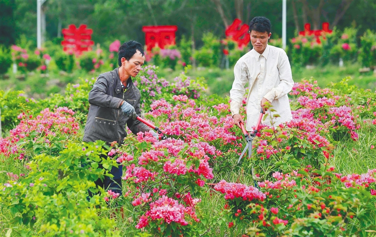 近日,在洋浦经济开发区三都区棠柏村的农民专业合作社苗圃基地,脱贫户羊让基(左)和陈良圣(右)在修剪花枝。据介绍,该合作社有298户贫困户入股,每年每户分红3000元。