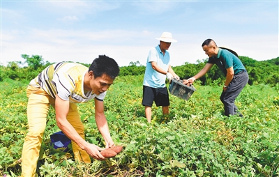 “王英蓉,25斤,2筐。”8月11日上午,澄迈县仁兴镇美厚村异常热闹。绿油油的地瓜田里,一头是来自仁兴镇6个村委会和海垦西达分公司的30余位党员干部顶着烈日,采挖地瓜,一头是村民依次将一筐筐丰收的地瓜搬到田埂上称重。在电子秤旁,美厚村副主任王汉良忙着将重量记录在账本上。