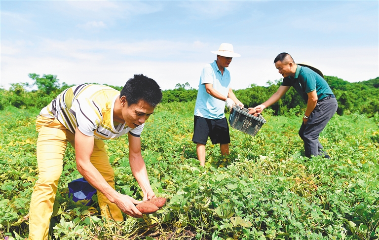 3月初,美厚村便开始平整土地、犁地起陇、栽种地瓜苗。为此,美厚村还成立合作社,邀请村里返乡创业大学生王川达任理事长,工作队员与村干部们都参与到地瓜基地管理中来。吴学斌还当起“销售员”,前往海口寻找订单,通过微信朋友圈发起认购活动,为地瓜打通销路。这块荒废近20年,杂草丛生的闲置地块重新恢复活力,成为富民产业“增长极”。
