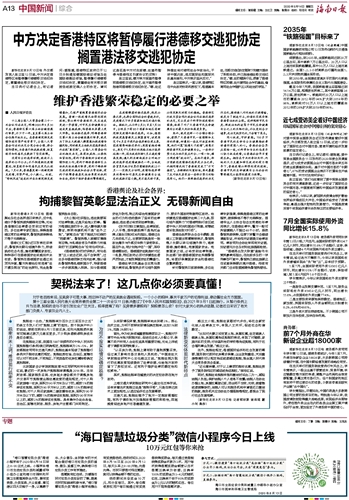 中方决定香港特区将暂停履行港德移交逃犯协定搁置港法移交逃犯协定