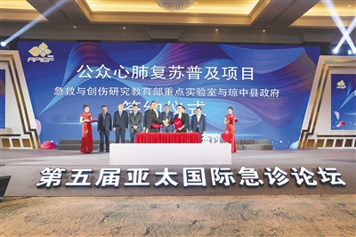开幕式上,由海南医学院第一附属医院牵头,我省20余家医疗机构、120急救中心组成的海南省道路交通事故人员损伤救援救治联盟正式成立并举行启动仪式。随后,公众心肺复苏普及项目启动,海南医学院急诊创伤学院分别与琼中黎族苗族自治县政府、三沙市政府、海口市龙华区政府和海口市120急救中心举行签约仪式。