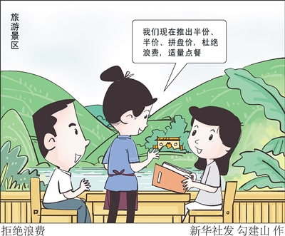 春秋旅游副总经理周卫红介绍,在旅游产品说明中,已经新增有关“杜绝餐饮浪费”的提示;在跟团游产品中,减少不必要的团餐安排。“我们还将在游客质量问卷中新增‘提倡节约’打分项,既是对从业人员监督,也能善意提醒游客。”她说。