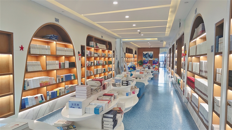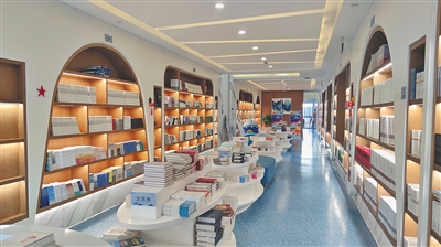 “天涯一卷书”海洋主题书店采取的是复合式空间设计,一楼是惠民书店加阅读空间,从海底世界的天幕大厅到如同海浪的白色弧线造型座椅,都融入了海洋的元素,书店的二楼是阅读空间加咖啡厅,为居民和游客营造出美好的休闲时光。