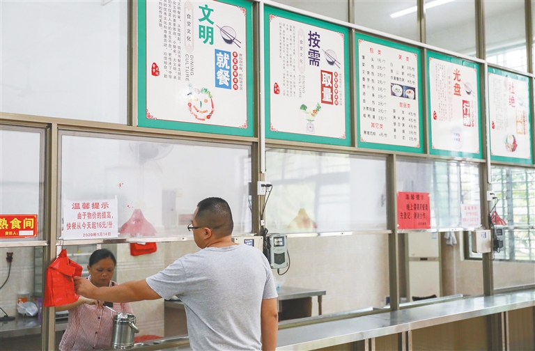 近日,屯昌县机关食堂工作人员在取餐窗口上方张贴醒目的宣传标语,提醒用餐职工节约粮食。 本报记者 李天平 摄