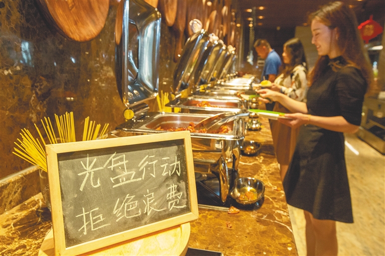 近日,在海口市的一家自助餐厅,取餐区摆放了写着“光盘行动 拒绝浪费”的提示牌,号召消费者以实际行动参与“光盘行动”。 本报记者 袁琛 摄