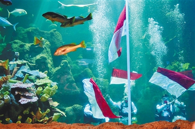 8月17日,印尼首都雅加达的一家水族馆举行水中升旗仪式,庆祝独立日。