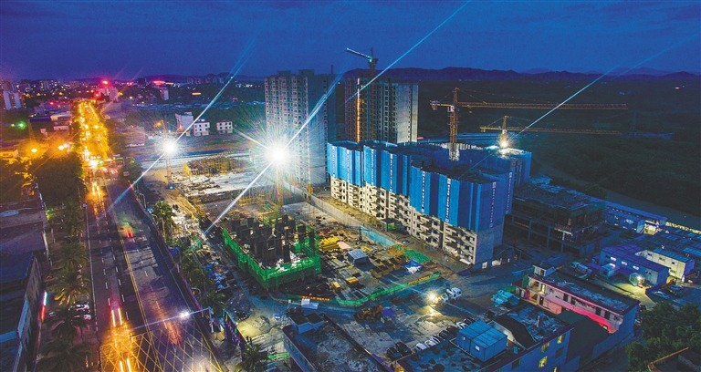 8月17日晚,夜幕降临,儋州那大番园棚户区城市更新改造项目分项目——雨林海滨海新城项目现场灯火通明,施工作业加快推进。
