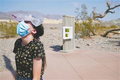 8月17日,在美国加利福尼亚州死亡谷,一名游客将冰袋放在额头上降温。