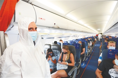 8月17日,一名穿着防护服的机组人员在一架由以色列本古里安国际机场飞往拉蒙国际机场的航班上工作。以色列卫生部17日晚公布的数据显示,以色列累计确诊94751例;累计死亡692例。新华社发