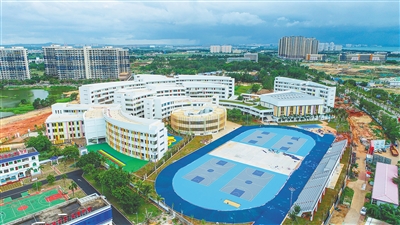 日前,俯瞰位于海口市秀英区新海港片区的新海学校(迁建)项目。目前,该项目已基本完工,将于今年9月正式投入使用。