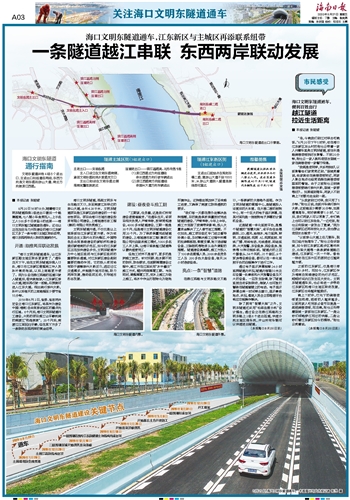2018年6月3日,省委、省政府决定设立海口江东新区,将其作为建设中国(海南)自由贸易试验区的重点先行区域。6个月后,海口文明东隧道开工建设,火热的项目施工让平静流淌的南渡江“热浪滚滚”。20个月后,南渡江江面回归平静,但在其下方多了一条联动东西两岸的黄金纽带。