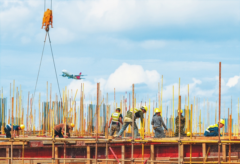 从海口市区出发,开车行驶至海口美兰国际机场国际航站楼,一侧就是正在建设中的美兰空港一站式飞机维修基地。在该项目工地,许多工人正顶着烈日施工,一栋栋正在建设的厂房被蓝色、绿色的施工防护栏包围。
