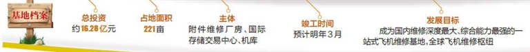 从高处俯看,整个基地呈正方形。周国双介绍,该项目总投资约16.28亿元,占地面积221亩,其中占地面积最大的是3类建筑,分别是附件维修厂房、国际存储交易中心、机库。其中,附件维修厂房分为主楼和副楼,总占地面积1.7万余平方米,国际存储交易中心分A、B区,总占地面积也超1.7万平方米。机库则分大修定检机库、宽体喷漆机库和窄体喷漆机库。3个机库总占地面积超3.8万平方米。除了上述建筑物外,该项目还将建设动力站、氧气车间、瓶体车间及两个危险品存放室。