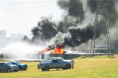 美国得克萨斯州达拉斯市附近一家存放塑料制品的设施19日凌晨起火,大火目前仍在燃烧,但未造成人员伤亡。当地消防部门负责人说,大火由电线坠落引发,可能会持续数日。 新华社发(田丹摄)