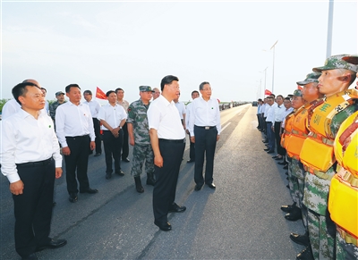 大堤上,习近平亲切看望慰问了在防汛抗洪救灾斗争中牺牲同志的家属、防汛抗洪一线人员、先进典型代表和参加抗洪抢险的部队官兵,并向全国奋战在防汛抗洪救灾一线的同志们表示诚挚的问候。他强调,今年入汛以来,南北方江河湖泊接连出现超警戒水位险情。广大干部群众和人民解放军、武警官兵坚决响应党和政府号召,发扬不怕累苦、不怕疲劳、不怕牺牲的精神斗志,坚守在防汛抗洪救灾第一线,涌现了许多先进典型和感人事迹,展现了中国人民众志成城、顽强拼搏、敢于胜利的英雄气概,书写了洪水无情人有情的人间大爱。党和人民感谢你们!